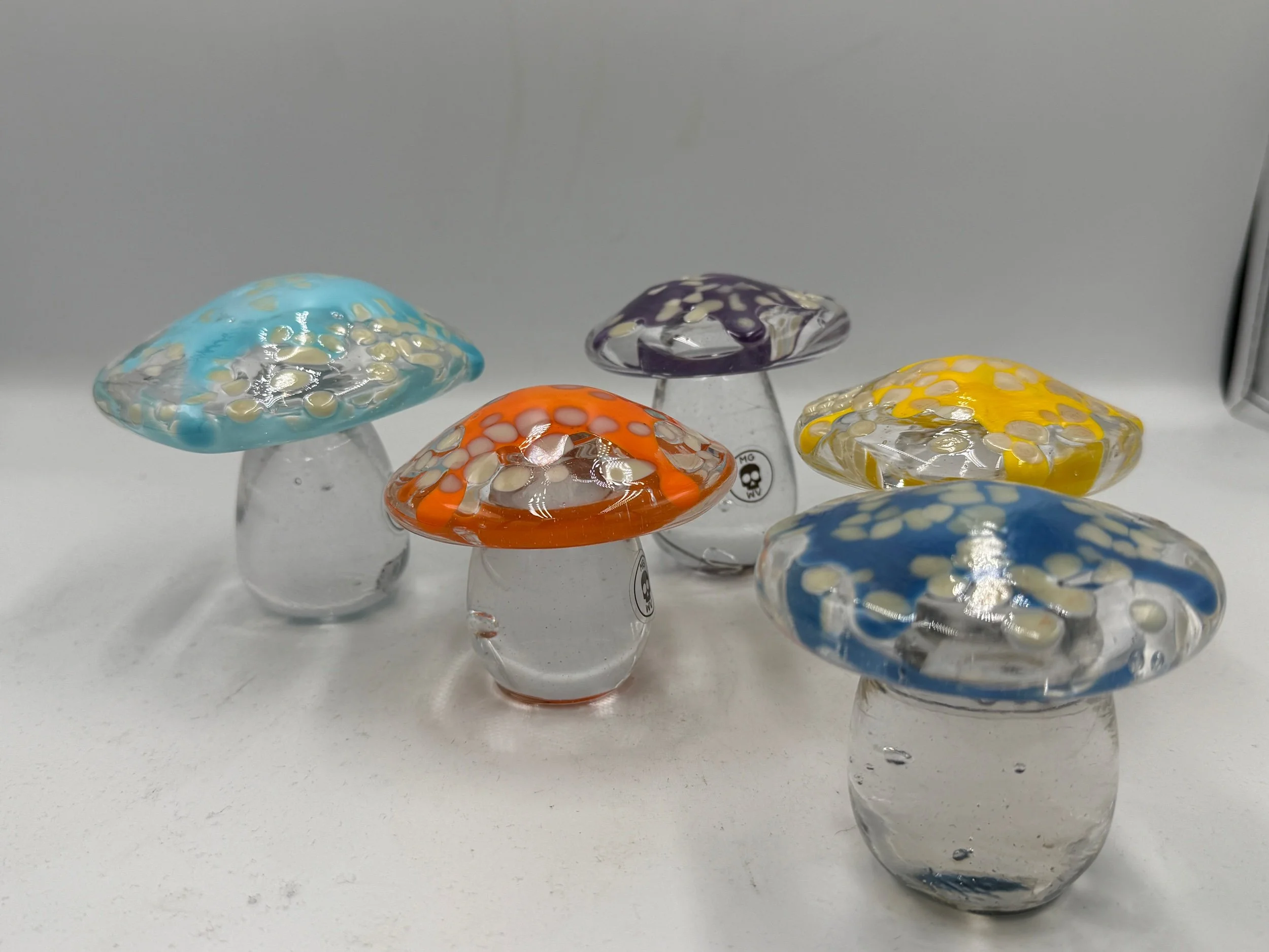 All of our mushrooms are handcrafted by hand in our glassblowing studio in Huntington, WV, in the grand tradition of West Virginia factory glass - whether the curvy stems of small sculpted Viking mushrooms, or Blenko’s frit foray in the late 1960s, small sculpted mushrooms are a trademark of the apex of Appalachian glassmaking.