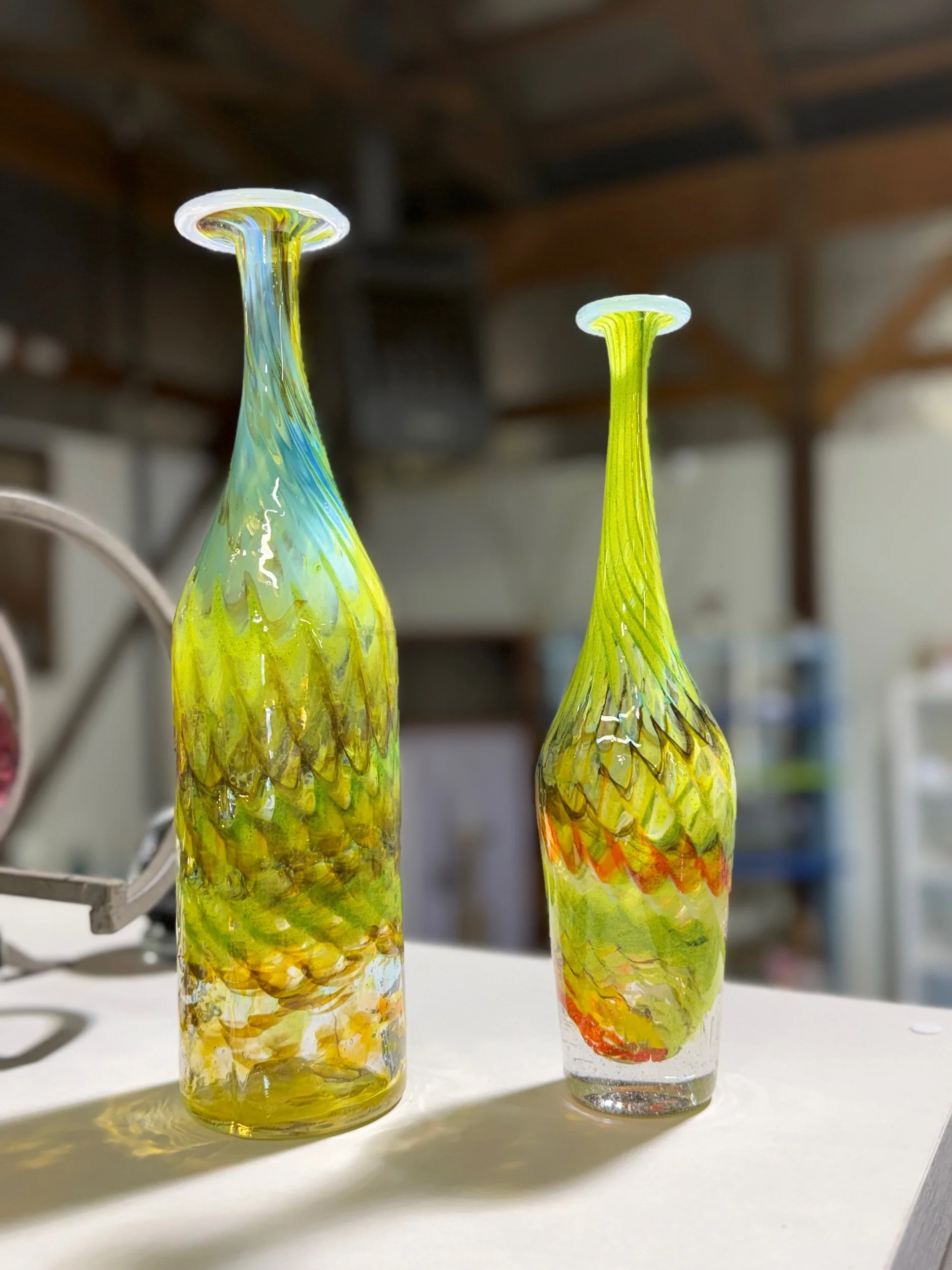 Tie Dyed Line › Flat Lip Bottle (Left) (Colorway1) Image 1 of 1 Flat Lip Bottle (Left) (Colorway1) $95.00 A stretched neck bottle in our first randomized tie dye colorway with a pale blue lip wrap. Add To Cart Added! A stretched neck bottle in our first randomized tie dye colorway with a pale blue lip wrap.