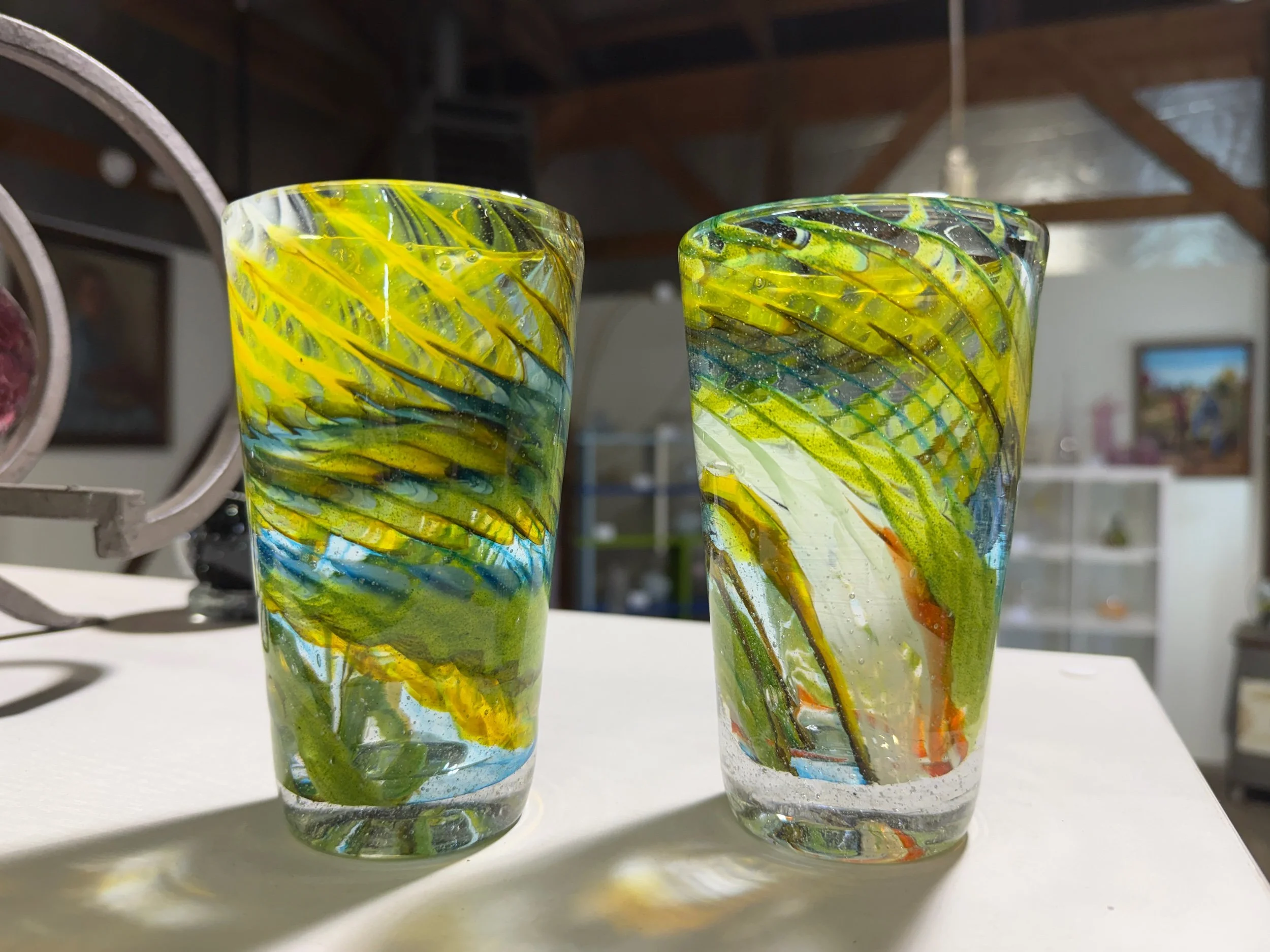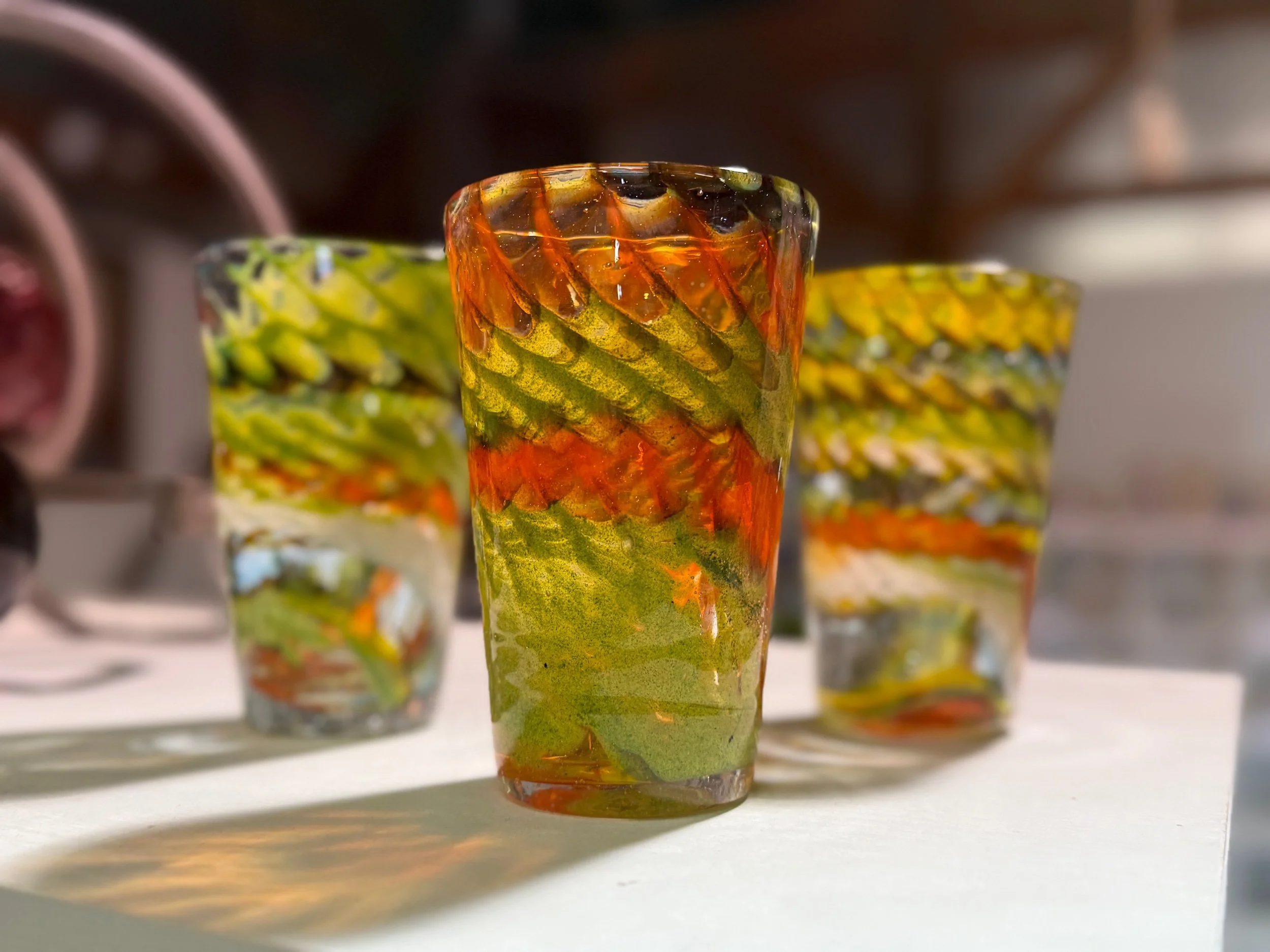 The twenty-sided die delivered Honey Yellow, Lime Aventurine, Sky Blue, Celadon, and Orange. The result is an acidic, sparkly tumbler with lime dominance.